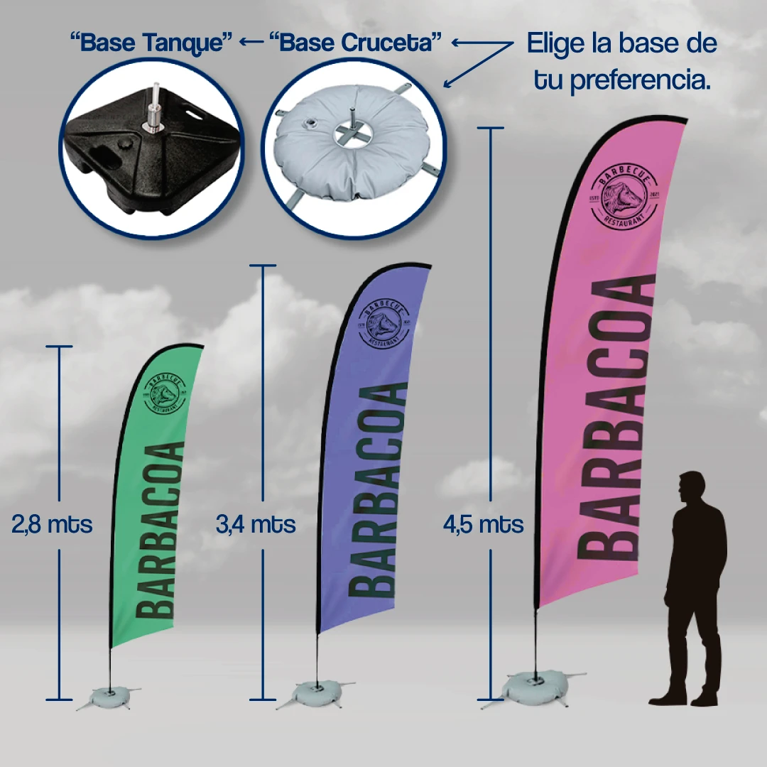 Dominio visual para exteriores con un diseño aerodinámico y moderno. La bandera tipo «D» es reconocible por su forma semicircular que aprovecha al máximo la superficie de impresión, creando una silueta llena y de gran presencia.