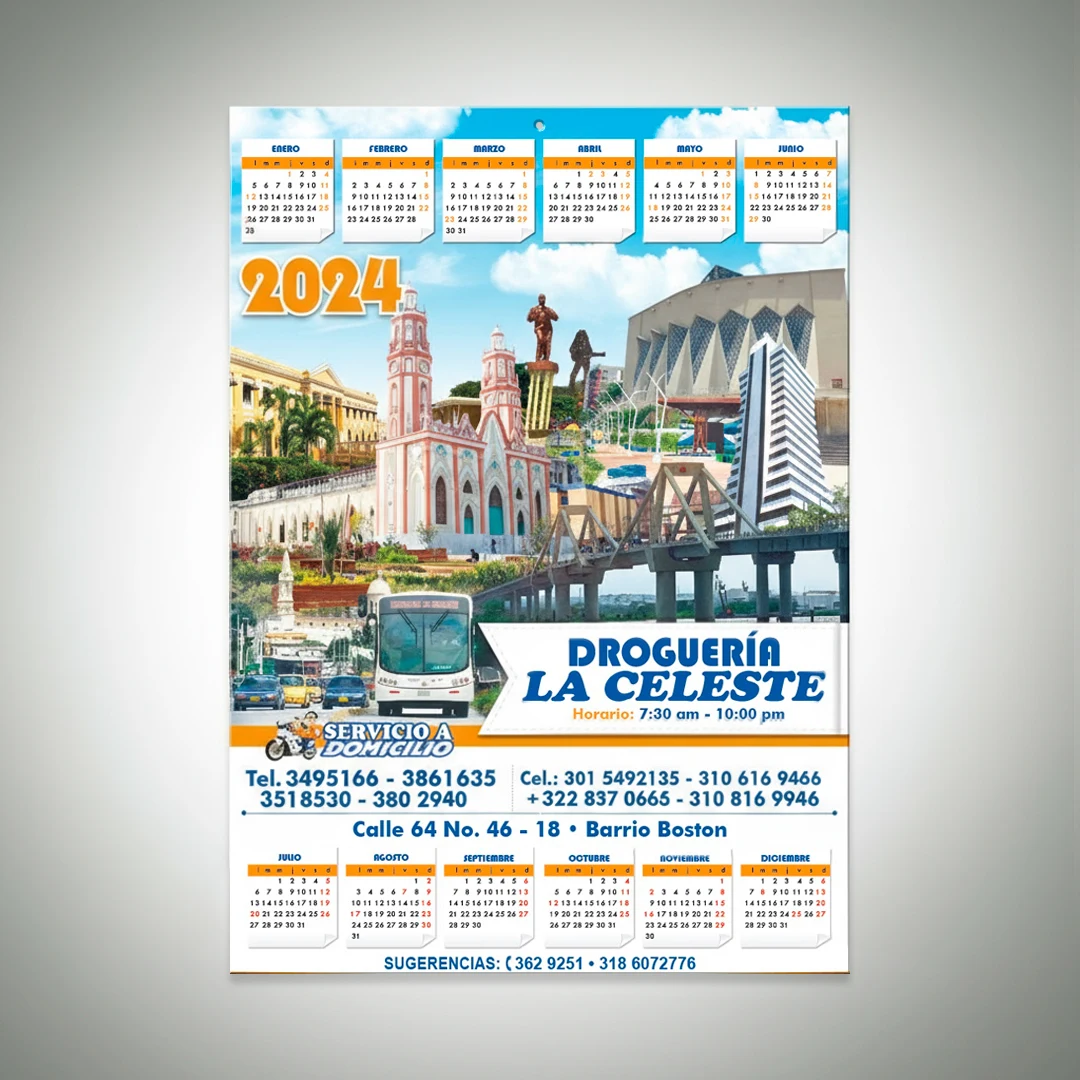 Presencia visual constante para negocios e instituciones. En un formato vertical de gran visibilidad, este calendario presenta diseños a color con imágenes llamativas y permite la visualización de varios meses de un solo vistazo. Es una herramienta ideal para promociones, negocios y uso institucional, manteniendo tu marca presente en un elemento de consulta diaria.
