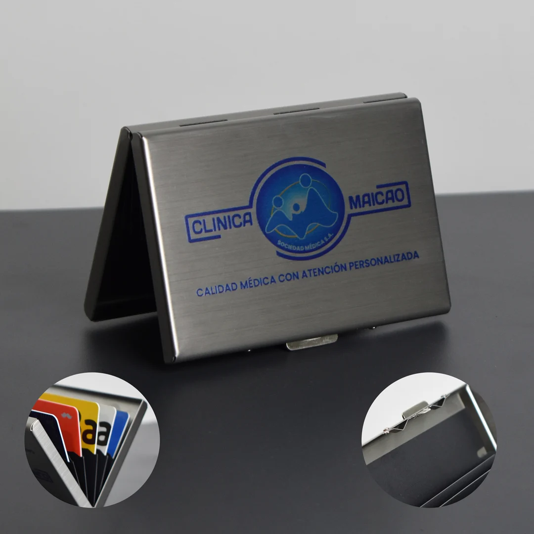 La elegancia profesional para tus presentaciones. Fabricado en metal de alta calidad, este tarjetero es elegante y resistente, diseñado específicamente para proteger y organizar tus tarjetas de presentación. Su diseño compacto y profesional cabe perfectamente en cualquier bolsillo, haciéndolo el accesorio indispensable para reuniones ejecutivas y eventos de networking donde la imagen es crucial.